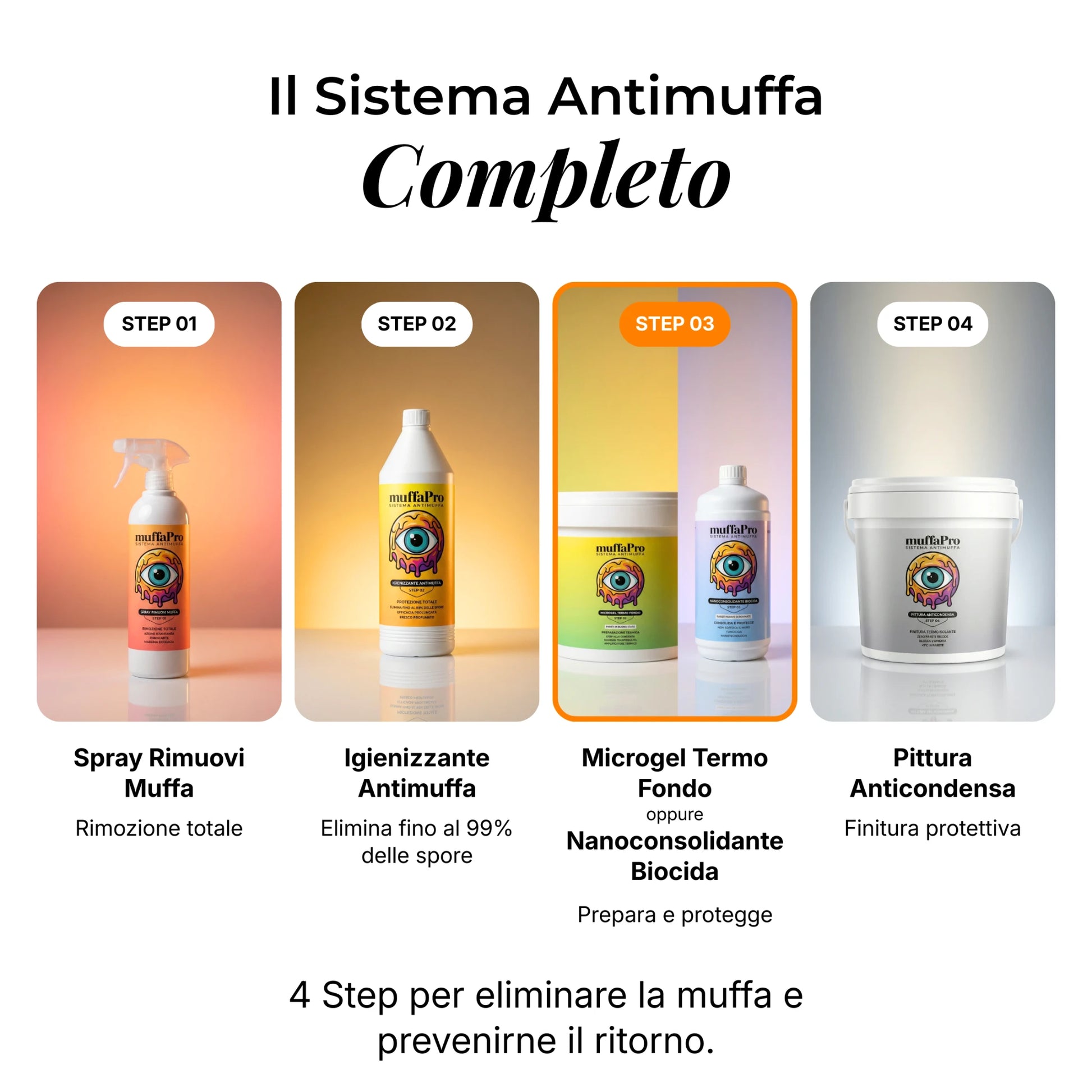 1. Preparazione: Se presente muffa, trattare prima con Spray Rimuovi Muffa (Step 01) e Igienizzante Antimuffa (Step 02).