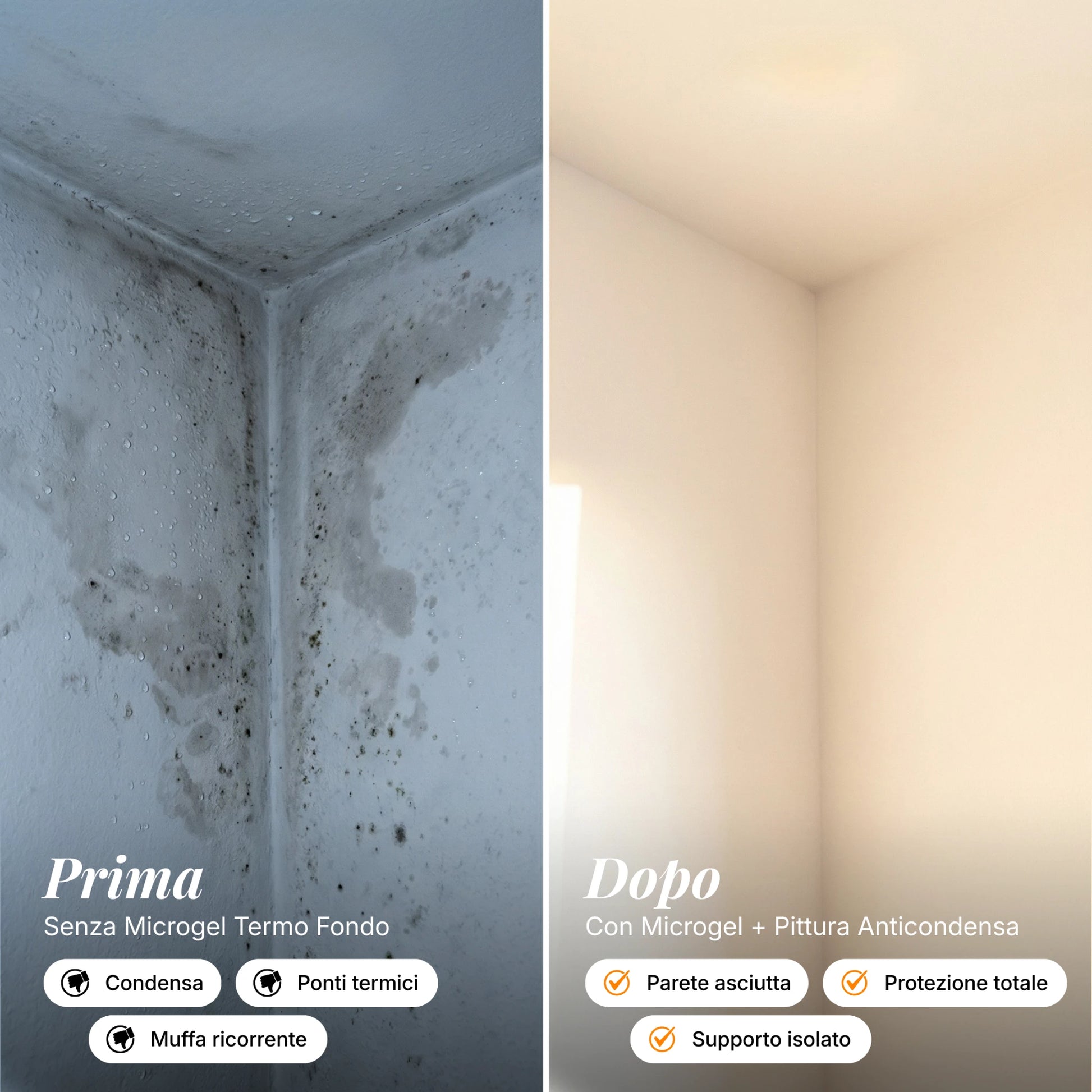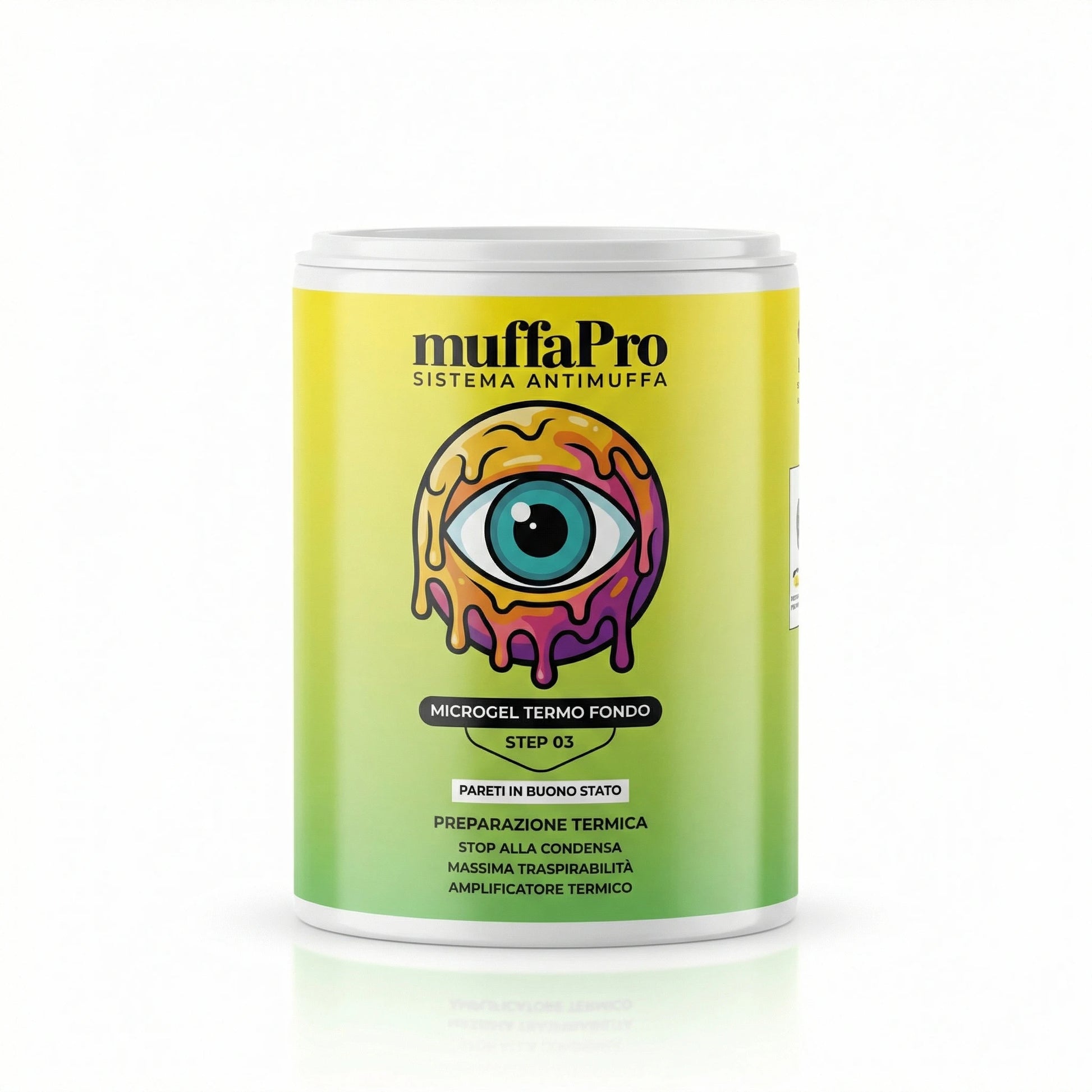 Microgel Termo Fondo è un primer ad alta penetrazione con microsfere cave in vetro 3M. Uniforma la temperatura superficiale delle pareti eliminando i punti freddi dove si forma la condensa. Applicato prima della Pittura Anticondensa MuffaPro, ne amplifica l'effetto isolante per una protezione completa. Ideale per pareti in buono stato in bagni, cucine, cantine e lavanderie. Per pareti nuove o rovinate, utilizzare invece il Nanoconsolidante Biocida MuffaPro.